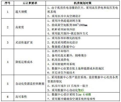 应对以上云计算对数据中心机房的要求,数据中心机房环境设计需要做一些相应的调整和考虑,其对策要点列表如下: